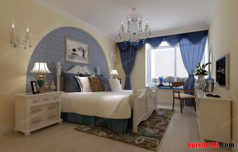 本套装修为地中海型装修,卧室地面采用地板装修,局部采用的地毯进行装饰,墙面采用的墙纸进行装修,吊顶采用石膏板进行平顶吊顶,加以水晶灯做装饰,空间注重大小色块间的组合,将地域性的配饰融入设计风格之中。线条简约流畅,色彩对比强烈,由于装修元素少,给居室留下变换的空间,与现代风格的硬装进行完美的配合,显示出美感。让居住者拥有一种自然简约的居室空间。