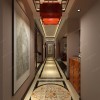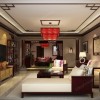 本套装修为中式古典型装修,客厅地面采用大理石装修,局部采用的地毯进行装饰,墙面采用的墙纸进行装修,吊顶采用石膏板进行平顶吊顶,加以火红吊灯做装饰,柔软的沙发,坐上去软绵绵的,好舒服,电视背景墙采用的是一幅梅花的图案,搭配旁边两个陈设的柜子,柜子上摆放了青花瓷,表示居住者对传统中式元素有独到的见解,墙面上的书法挂画,带来的文化性和独特魅力,营造了一个静谧的独立的空间。