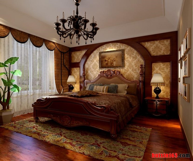本套装修为西式古典型装修,卧室地面采用地板装修,局部采用地毯进行装饰,墙面采用的是墙纸进行装修,吊顶采用石膏板进行平顶吊顶,加以吊灯做装饰,床头采用的是拱形,展现出了拱形的装饰,不仅美观,还具有豪华、动感、多变的效果。在造型上,线条勾勒出不同的装饰造型,气势恢宏、典雅大气。在家具配饰上,以华丽、明亮的色彩,配以精美的造型达到雍容华贵的装饰效果。给人一种华丽的感觉。