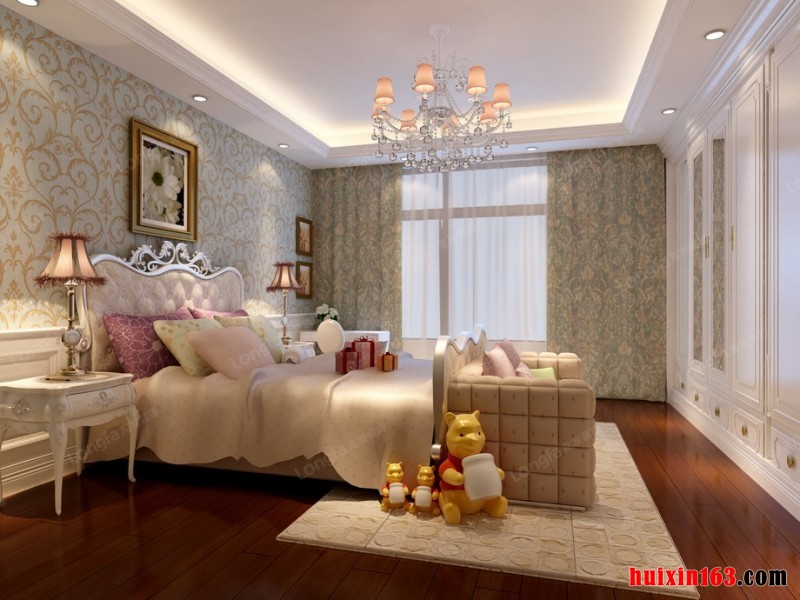 本套装修为欧美型装修,卧室地面采用地板装修,局部采用地毯进行装饰,墙面采用的是墙纸进行装修,吊顶采用石膏板进行平顶吊顶,加以水晶灯做装饰,欧式风格融入了现代的生活元素。欧式的居室有的不只是豪华大气,更多的是惬意和浪漫。色彩明快跳跃,外立面简洁流畅,正面立体层次感较强。没有过分的装饰,一切从功能出发,讲究造型比例适度、空间结构图明确美观,给人一种富有朝气的生活气息。