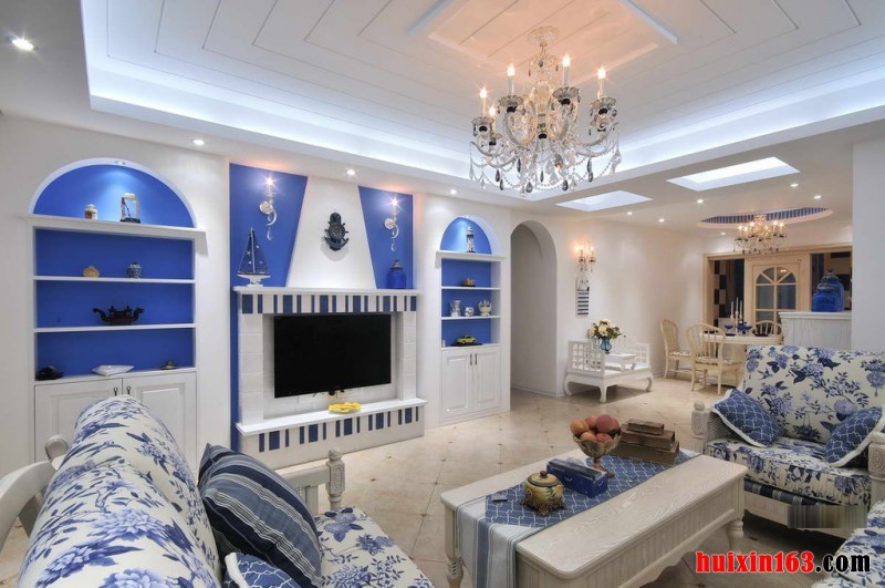 本套装修为地中海型装修,客厅地面采用大理石装修,墙面采用白色的乳胶漆进行装修,吊顶采用石膏板进行平顶吊顶,加以水晶灯做装饰,沙发好像青花瓷一般,色彩绚丽、装饰精美,木质的茶几,留给了人们纹络的美感,电视背景墙采用的是嵌入型的风格,把电视包围起来,起到了一个保护的作用,两边是两个白色的柜子,背景墙采用的蓝色,给人一种好过像仰望蔚蓝的天空的感觉,整体给人一种大海的味道。
