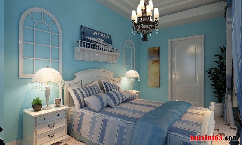 本套装修为地中海型装修,卧室地面采用地板装修,墙面采用白色的乳胶漆进行装修,吊顶采用石膏板进行平顶吊顶,加以吊灯做装饰,白色加蓝色条条状的床,干净整洁,床的两边陈设了两个床头柜,以及白色的台灯,就好像左右手一样,墙上两个拱形的假窗户对墙面起到了装饰的作用,布艺的窗帘,在微风吹拂下,演技着它那动人的舞姿,整体给人安宁闲适的感觉,清雅舒适。