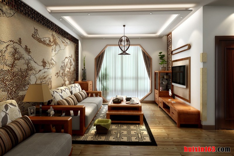 本套装修为中式古典型装修,客厅地面采用地板装修,局部采用地毯进行装饰,墙面采用白色乳胶漆进行装修,吊顶采用石膏板进行平顶吊顶,加以吊灯做装饰,色泽光亮加以软包的沙发,坐上去好舒服,壁画以及家具颜色和谐,空间规矩端方,别有一种气魄。具有八个角的球体门,把空间分割成了阳台,就好使是一个射门一样,给人一种对称的感觉,空间显得更加大气,庄重,展现出了中国传统艺术的永恒美感。