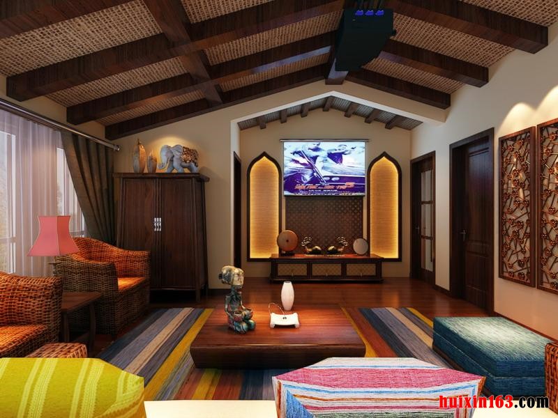 本套装修为东南亚型装修,客厅地面采用地板装修,局部采用地毯进行装饰,墙面采用的墙纸进行装修,吊顶采用石膏板进行平顶吊顶,加以吊灯做装饰,东南亚风格的沙发,舒适柔软,沙发墙面上挂了几幅挂画,起到一个装饰点缀的作用,黑色的电视播放着精彩的节目,客厅与餐厅是连在一起的,藤编的椅子配以木式的餐桌,共同演绎了时尚的魅力,整个空间给人一种古朴的民俗风情。