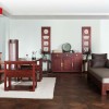本套装修为中式古典型装修,书房地面采用地板进行装修,局部采用地毯进行装饰,墙面采用的是白色的乳胶漆进行装修,吊灯采用石膏板进行平顶吊灯,加以吊灯做装饰,家具造型简练、形象淳朴、从中国传统古建筑中汲取设计灵感,造型讲究方圆配比,比例适度,线脚运用适当。窗棱结构等隐藏在细节处,用细腻的细节笔触,给予产品丰富的想象空间。保持非洲花梨的自然纹理和色泽,无论从视觉、手感,都确保了自然、典雅、高贵的气度。
